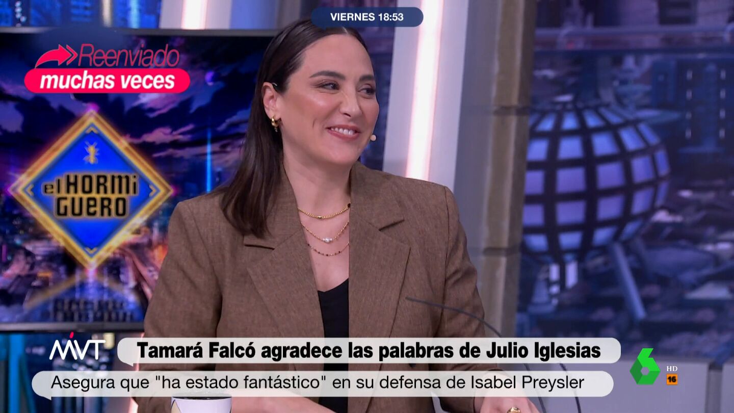 Tamara Falcó agradeció el apoyo de Julio Iglesias a su madre, Isabel Preysler, en 'El Hormiguero'. "Ha salido en defensa de mi madre, que no está pasando su mejor racha, la verdad. Era un golpe tras otro, y él ha salido a defenderla", expresó la marquesa de Griñón, quien lanzó una pregunta: "¿No os parece súper bonito y súper romántico que salga un exmarido a defenderte?". Para Falcó, este gesto fue una muestra "de respeto" hacia su madre.