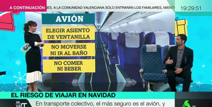 - Avión: en este caso es preferible elegir el asiento de la ventanilla, porque en el del pasillo estamos más expuestos al trasiego de personas. No obstante, los aviones cuentan con filtros HEPA, que generan láminas de aire y te aíslan de forma bastante eficiente. Asimismo, es importante no moverse ni ir al baño, ni comer o beber durante el vuelo. Mientras más largo sea el trayecto, más riesgo.