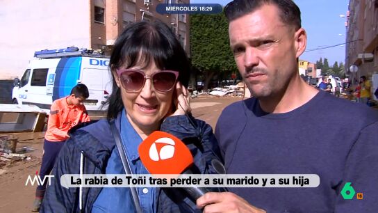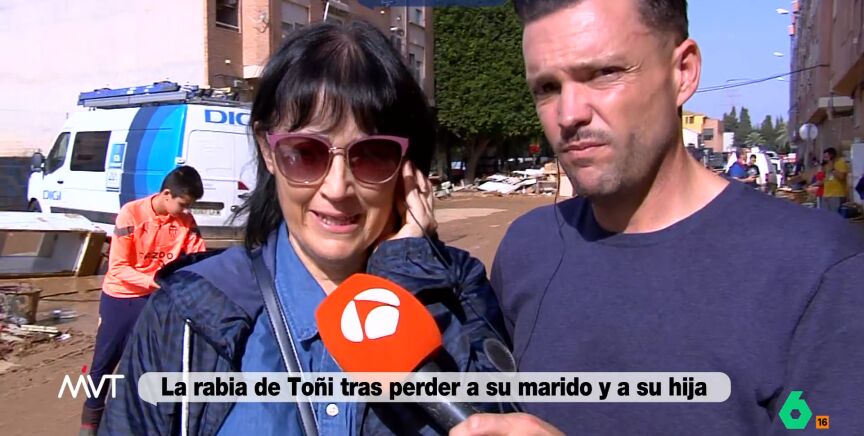 Toñi es una mujer que ha perdido a su marido y a su hija por las riadas provocadas por la DANA. Sin embargo, ella es compañera de trabajo de la consellera de Turismo, Nuria Montes, con la que se ha mostrado especialmente indignada y ha anunciado que iniciará acciones legales, ya que considera que la gestión de esta tragedia ha sido negligente.