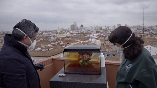 Para demostrado, hace a cámara un experimento en el que se cómo afecta la contaminación del aire, en este caso a una planta. Con guantes para protegerse, mascarillas y gafas para que no les afecte a ellos, Sánchez echa en un recipiente ácido nítrico y unas cuantas monedas que se van poniendo verdes debido al cobre.