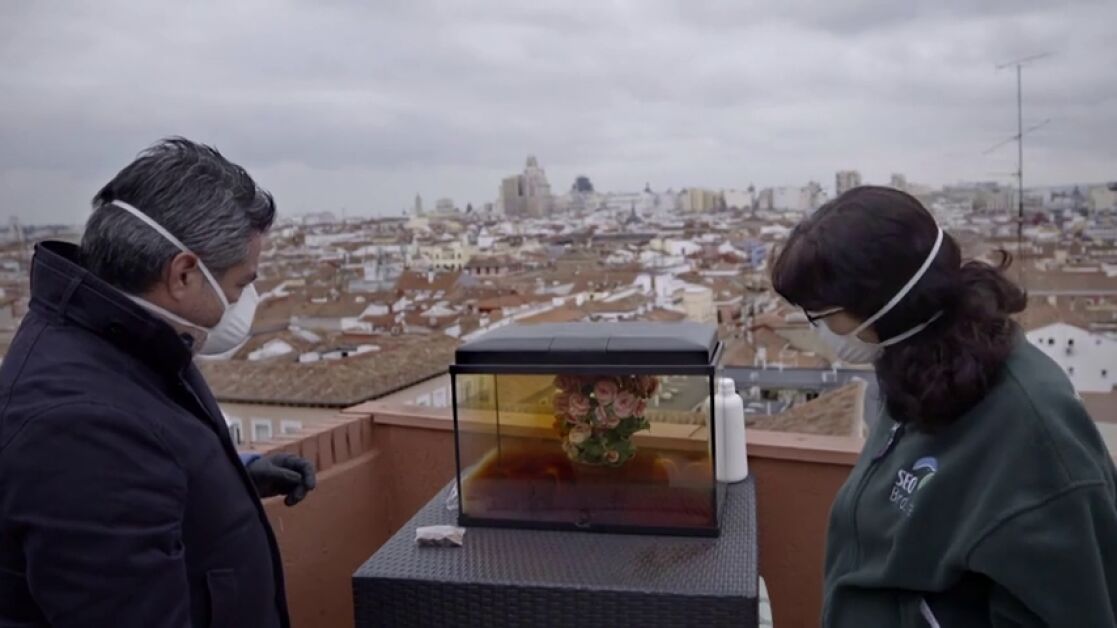 Beatriz Sánchez, ambientóloga de la Sociedad Española de Ornitología, hace un experimento en Natural con una urna de cristal, una planta, ácido nítrico y unas monedas para mostrar cómo afecta la contaminación a los gorriones y por consiguiente al ser humano.