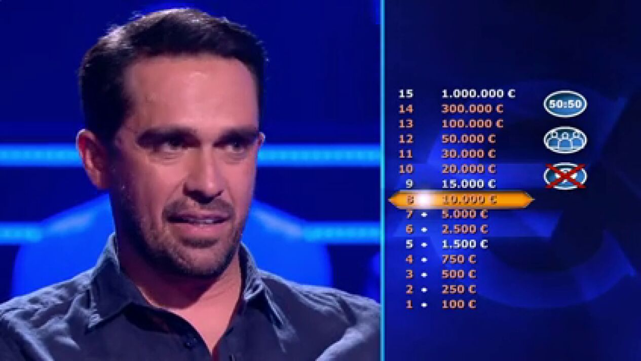 El ciclista confiesa sus nervios en ¿Quién quiere ser millonario? hasta tal punto de que desvela a Juanra Bonet que está sudando más que cuando hace ciclismo: "Si podéis acortar el suspense, porque me voy a quedar sin dientes".