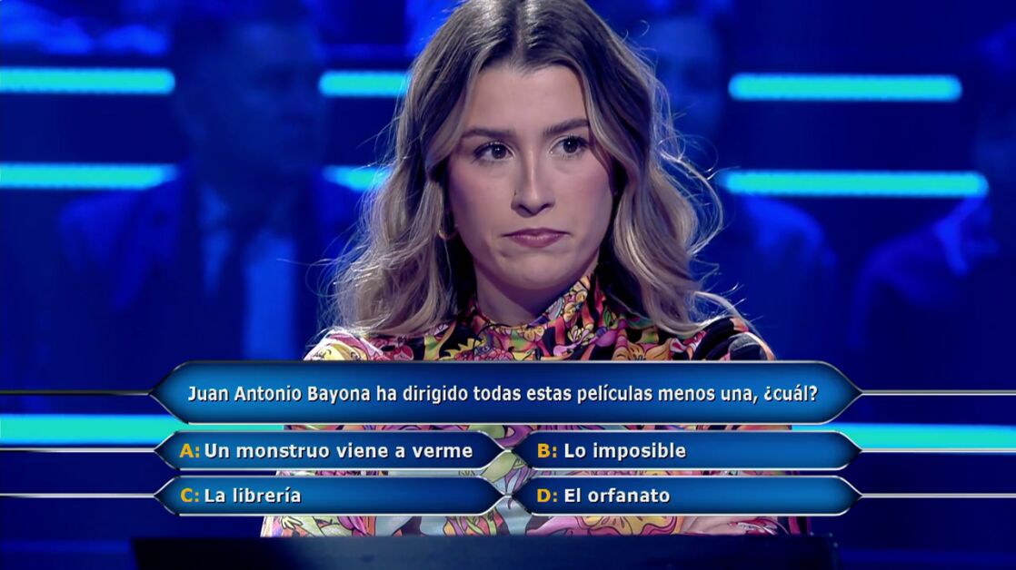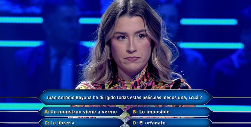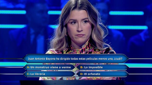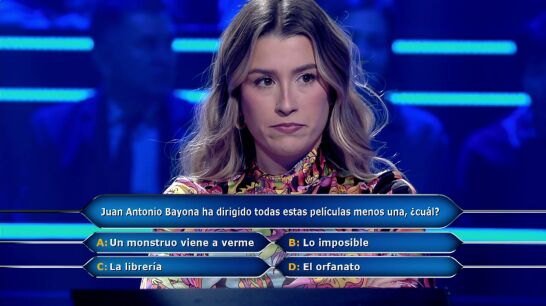 Eva Soriano llega a la pregunta ocho de ¿Quién quiere ser millonario? con todos los comodines menos el del público. "Juan Antonio Bayona ha dirigido todas estas películas menos una, ¿cuál?", es la pregunta a la que tiene que responder. "'A': Un monstruo viene a verme, 'B': Lo imposible, 'C': La librería, 'D': El orfanato", lee Juanra Bonet.