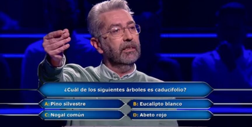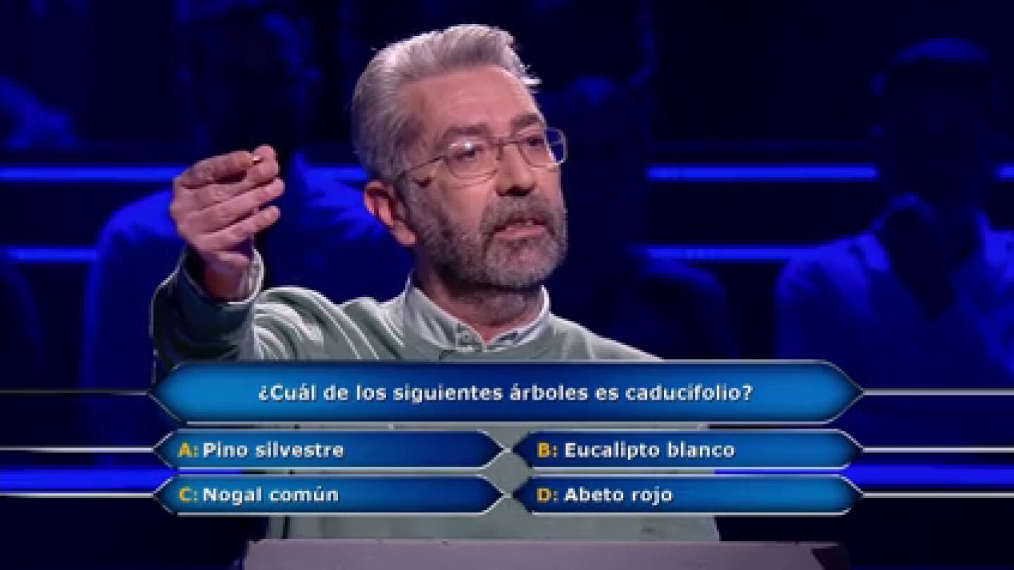 ¿Cuál de los siguientes árboles es caducifolio? ¿Pino silvestre, eucalipto blanco, nogal común o abeto rojo? Juanma, el primer concursante de la noche, duda entre dos, pero ya ha gastado el comodín del 50%.