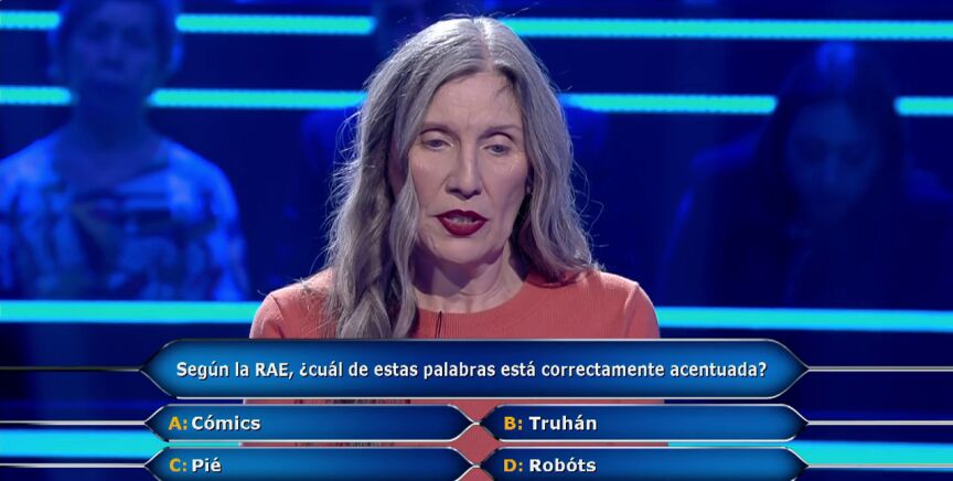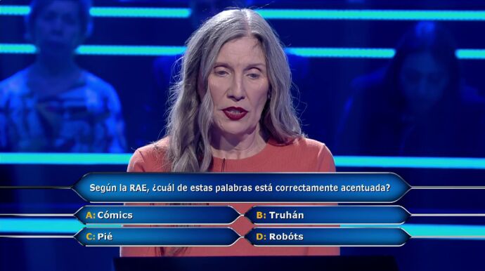 Llega la pregunta siete de ¿Quién quiere ser millonario? A Esther le quedan dos comodines después de gastar el del público por culpa del lugar de nacimiento de Messi. "¿Cuál de esta palabras esta correctamente acentuada?" es la pregunta a la que se enfrenta. La concursante sonríe al escucharlo porque es una persona muy quisquillosa con la ortografía, no aguanta las faltas. Juanra Bonet lee las opciones que tiene: "'A': Cómics, 'B': Truhán, 'C': Pié, 'D': Robóts". "Soy la líder brazo armado de la lucha contra la mala ortografía, entonces me vas a dar un gran disgusto si me dices que no es truhán", comenta la aspirante al millón nada más escuchar las respuestas. Aunque se arrepiente rápidamente porque se da cuenta de que truhán es un diptongo.