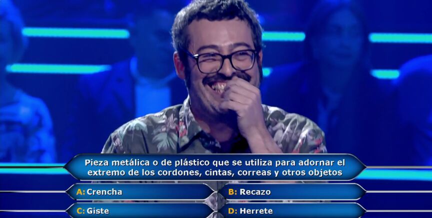 El concursante de ¿Quién quiere ser millonario? llega a un momento clave en su concurso, la pregunta en la que ha marcado su segundo seguro. Para conseguirlo tendrá que saber el nombre de la pieza metálica o de plástico que se utiliza para adornar el extremo de los cordones, cintas, correas y otros objetos. Las posibles respuestas son 'Crencha', 'Recazo', 'Giste' y 'Herrete'.