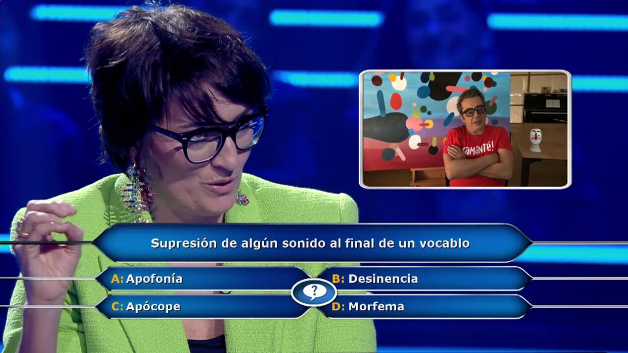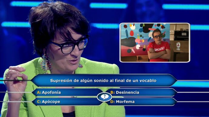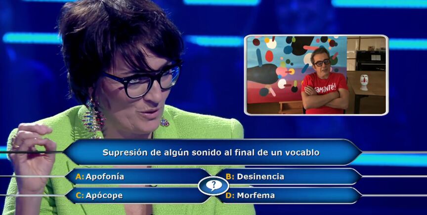 Silvia Abril se enfrenta a su pregunta número 9 en ¿Quién quiere ser millonario? y que le haría lograr 15.000 euros. La actriz debe decir cómo se llama la supresión de algún sonido al final de un vocablo. "Ostras", afirma la actriz alucinada mientras Juanra Bonet le va dando las opciones: apofonía, desinencia, apócope o morfema.