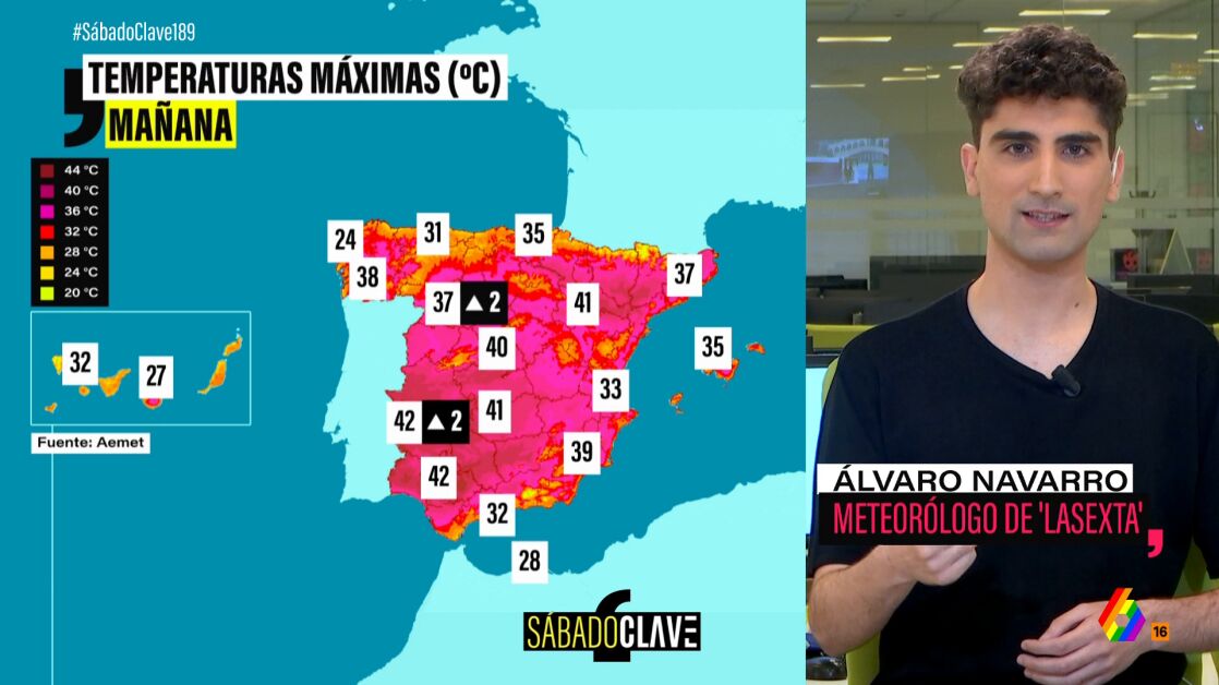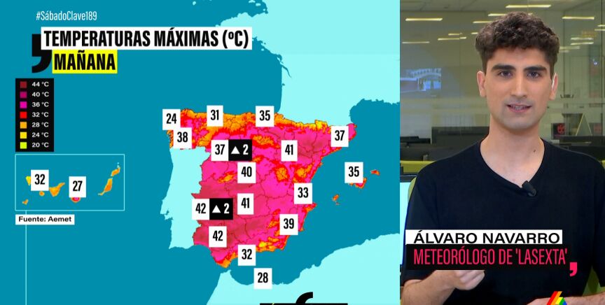 El meteorólogo de laSexta Álvaro Navarro ha detallado en Sábado Clave las temperaturas que se esperan para este domingo, en el que se superarán los 40 grados en puntos del sur como Córdoba o Sevilla.
