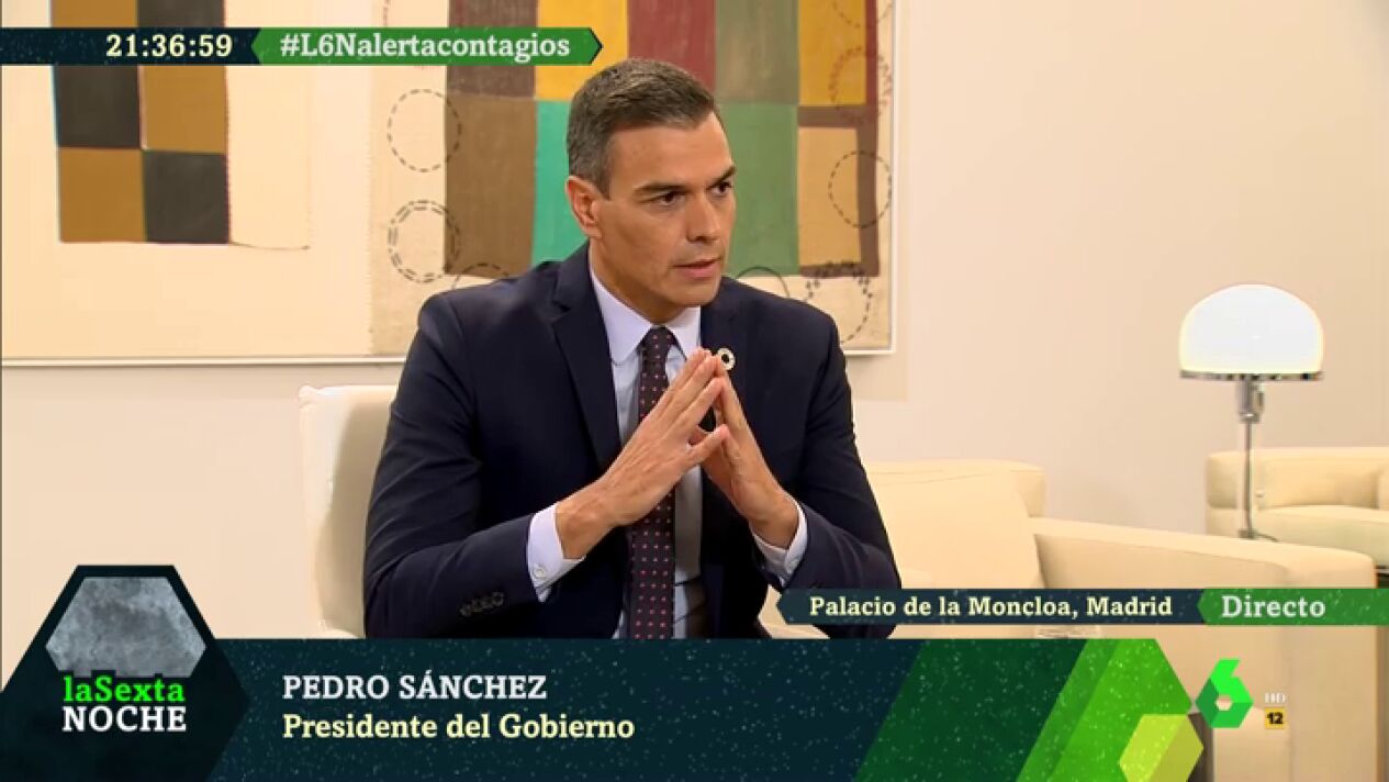 Pedro Sánchez admite en laSexta Noche su "preocupación" por los últimos datos de la pandemia, que el pasado viernes dejó más de 14.000 nuevos contagiados en nuestro país. Sin embargo, ha querido dejar claro que no contempla un nuevo confinamiento en España, aunque reconoce que no se puede cerrar ninguna puerta dependiendo de cómo avance el virus.