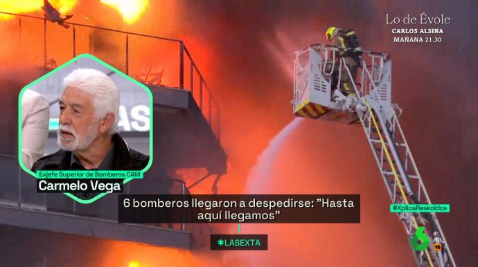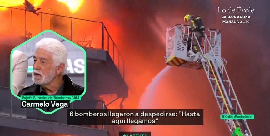 "¿Alguna vez habías visto algo similar en tu trayectoria?", pregunta el presentador del programa a Carmelo Vega, exjefe Superior de Bomberos de la CAM con una trayectoria de 50 años. "Estamos ante el caso más inverosímil de un siniestro en un edificio", responde él, ya que el incendio hizo que ardiera el bloque al completo en tan solo 50 minutos y, como se puede ver en la imágenes de la secuencia, en los "primeros 12 minutos el incendio está fuera de control".