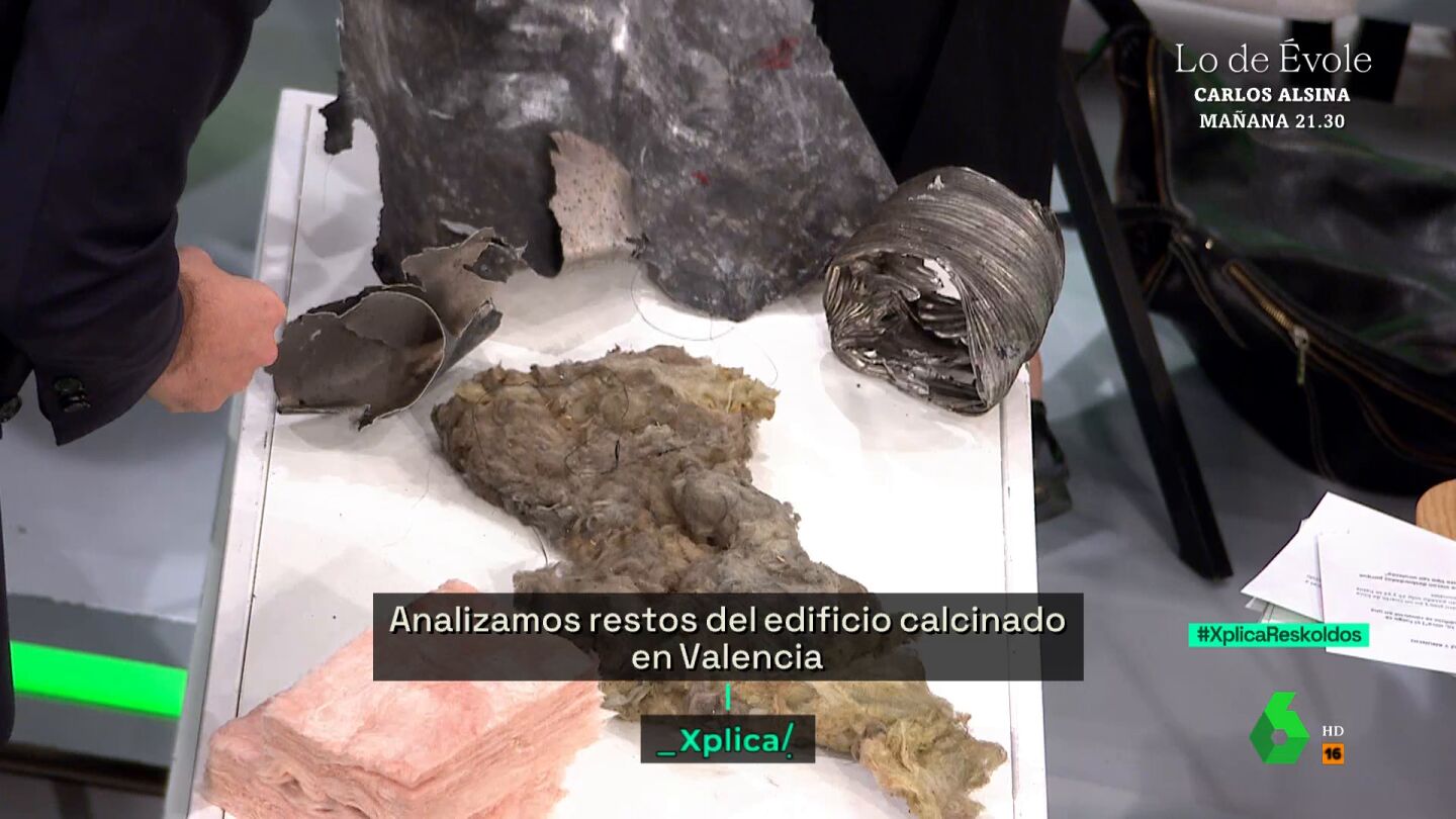 Varios expertos analizan en laSexta Xplica algunos restos que ha recopilado nuestra compañera Laura Herraiz del edificio calcinado en Valencia. Como explica, Yélamo en este vídeo, "es parte del material que ha salido volando de ese incendio, que ha sido proyectado por las llamas y el viento en el entorno" del bloque de viviendas.