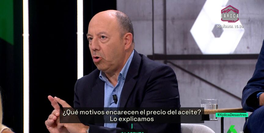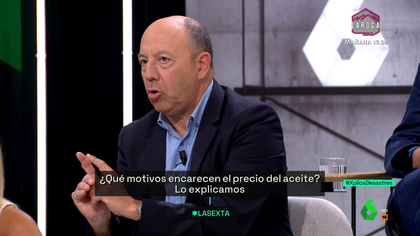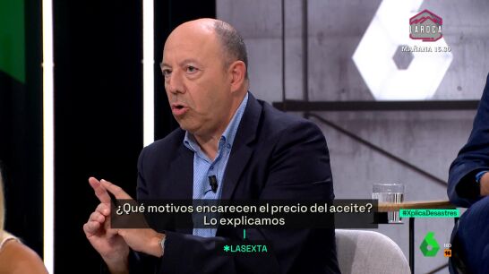 El profesor de Economía de la Universidad de Barcelona, Gonzalo Bernardos, analizó en laSexta Xplica la evolución al alza del precio del aceite de oliva. "El agricultor de las frutas se lleva, muchas veces, menos del 20% del precio del producto final y el de aceite de oliva un 45%", explicó.