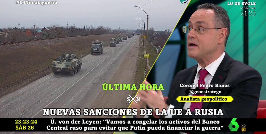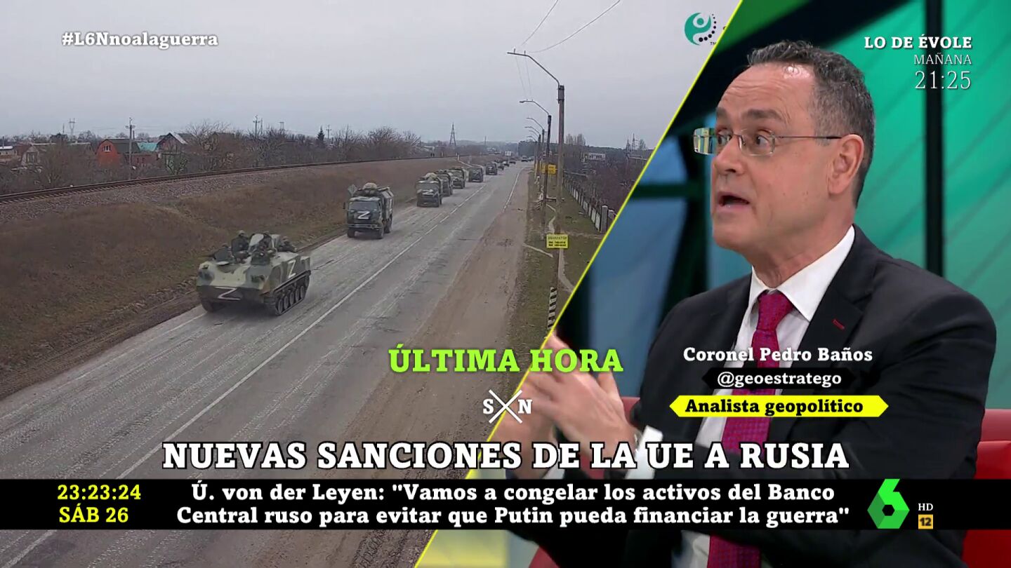 Pedro Baños, coronel en la reserva, ha querido analizar en laSexta Noche cuáles podrían ser las intenciones de Putin en Ucrania tras las nuevas sanciones a Rusia que la Unión Europea anunció en la noche de este sábado: "Todas estas medidas van encaminadas a no financiar la guerra a Putin. Las guerras son carísimas, y ya decía Napoleón que las guerras se hacen con tres cosas: con dinero, dinero y dinero, y de eso ahora mismo Putin no va muy sobrado". El experto en geoestrategia cree, no obstante, que estas medidas podrían llevar la guerra a un escenario preocupante.