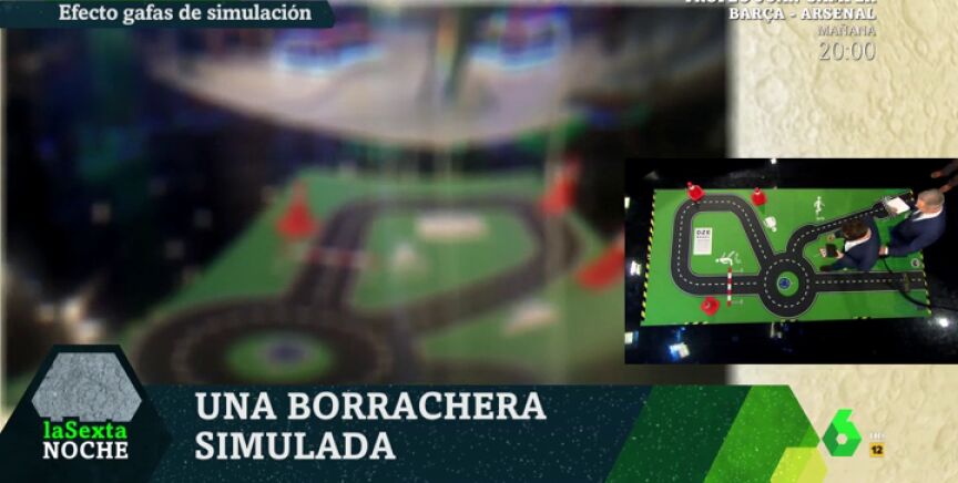 Después, en el circuito que laSexta Noche ha preparado, llega una rotonda. Aunque puede parecer sencillo, con las gafas que simulan los efectos del alcohol, requiere más esfuerzo del habitual.