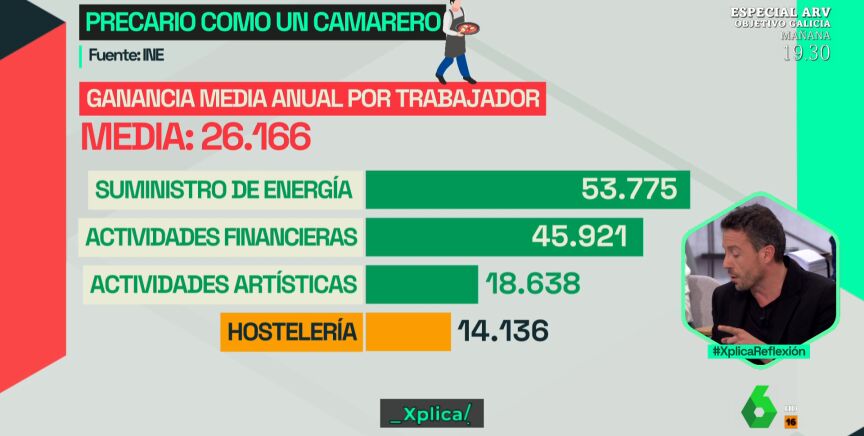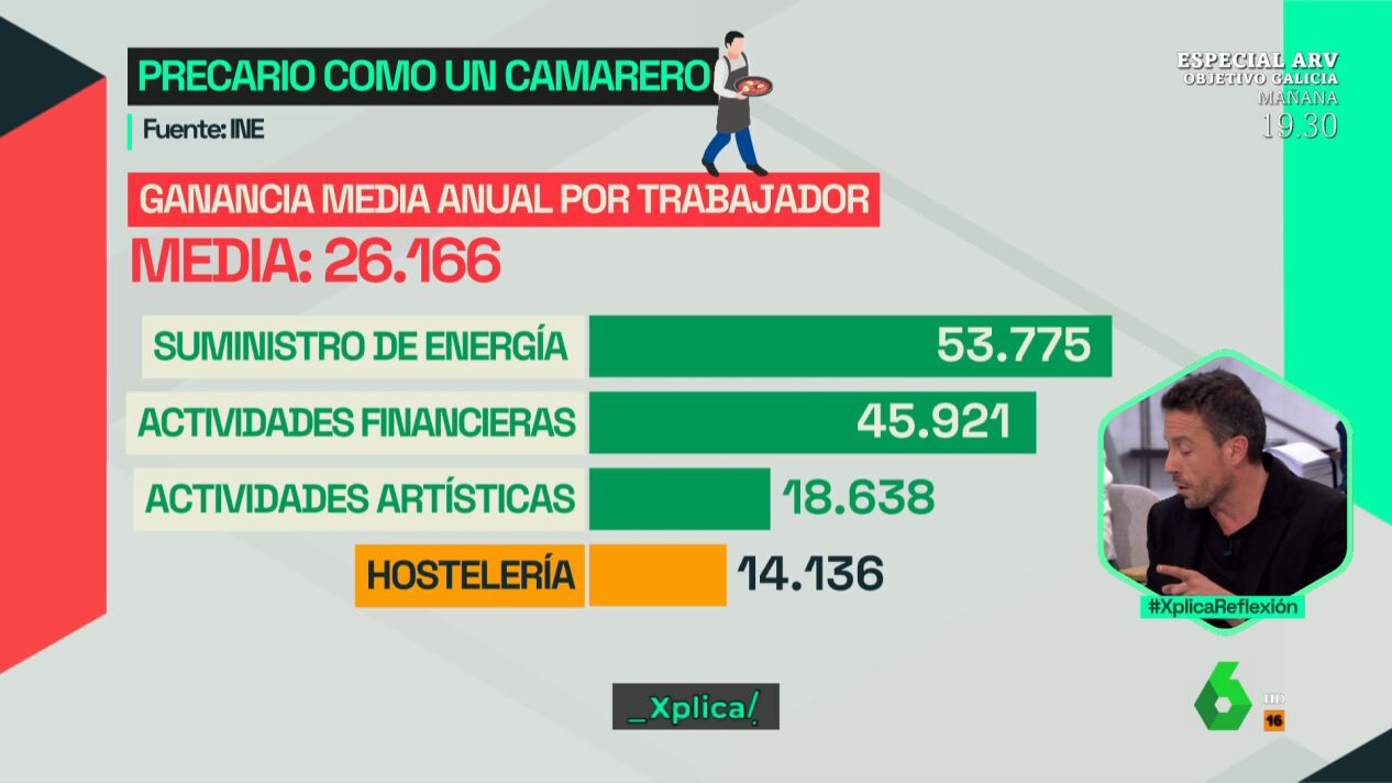 Y los datos aportados por el INE en un estudio lo confirman. Según el Instituto Nacional de Estadística, un trabajador de la hostelería cobra 14.136 euros al año, casi la mitad del sueldo medio nacional que se sitúa en 26.166 euros anuales.