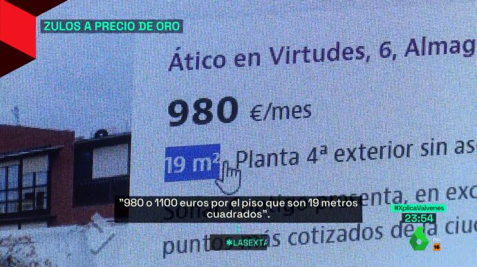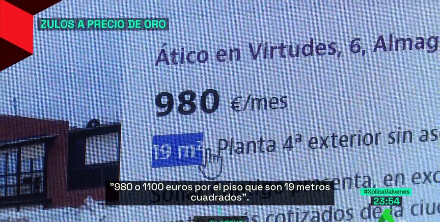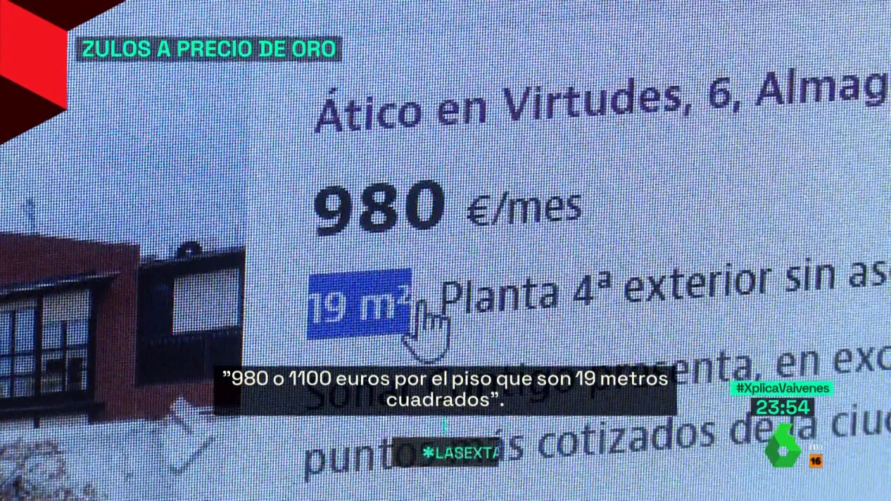 Uno de los motivos es los zulos a precio de oro. Hay viviendas de menos de 25 metros cuadrados a precios imposibles. laSexta Xplica llamó a un anuncio en el que se ofrecía un 'piso' de 19 metros cuadrados por 980 euros en Madrid. Al preguntarle al dueño por el elevado precio, el hombre era claro: "Tengo 400 pisos así y están todos alquilados, y este se acaba de quedar disponible que se alquilará también, bienvenida al mundo real".
