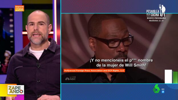 Alberto Rey visita el plató de Zapeando para analizar todos los detalles de los Globos de Oro 2023. En el vídeo de arriba el experto en cine analiza el chiste viral de Eddie Murphy, el protagonista del Globo de Oro honorífico. "Quiero que sepáis que hay una guía definitiva que podéis seguir para alcanzar éxito, prosperidad y paz mental", afirmó Eddie Murphy, que enumeró: "Pagad vuestros impuestos, meteos en vuestros asuntos y no mencionéis el p*** nombre de la mujer de Will Smith".