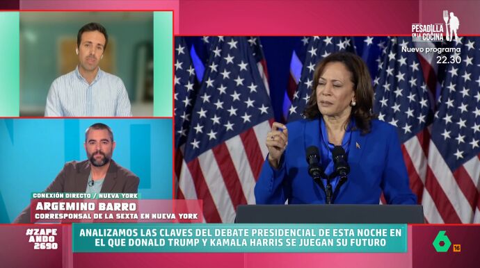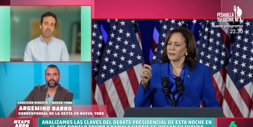 En pocas horas se va a celebrar un debate electoral que enfrentará a Donald Trump y Kamala Harris. Para conocer las claves del debate y cómo se está viviendo en Estados Unidos, Zapeando conecta con el periodista Argemino Barro, corresponsal de laSexta en Nueva York. Como indica el periodista, es previsible que esta cita televisiva entre los candidatos a la Casa Blanca tenga mucha audiencia. "El anterior debate tuvo 50 millones de espectadores, este probablemente tenga más", apunta.