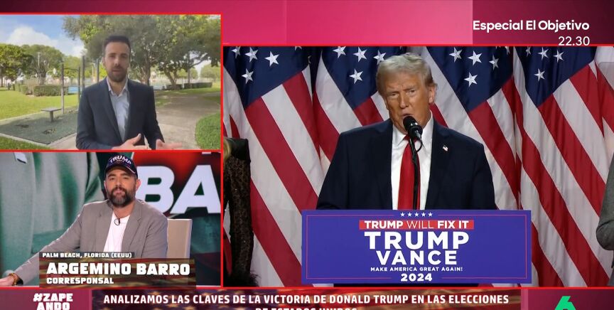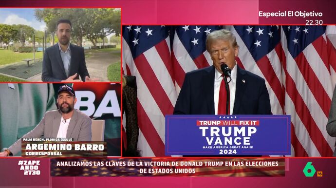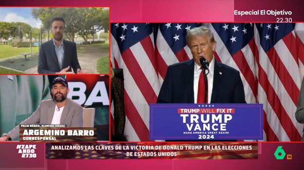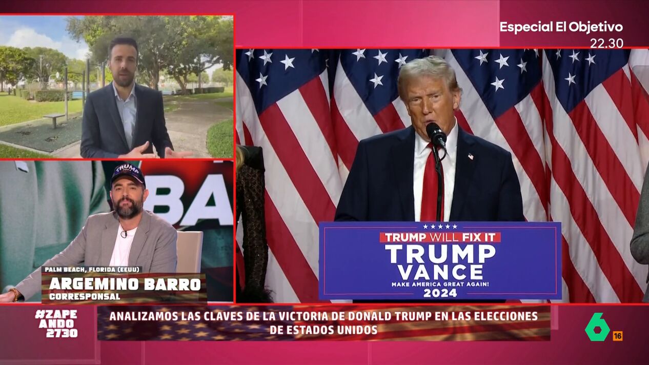 El corresponsal Argemino Barro conecta desde Palm Beach, Florida, con Zapeando para analizar la victoria de Donald Trump en las elecciones de Estados Unidos. "Se pronosticaba casi un empate técnico", empieza diciendo Dani Mateo. "Pero al final no ha habido partido, ¿cómo se explica esto?", pregunta el presentador de Zapeando.