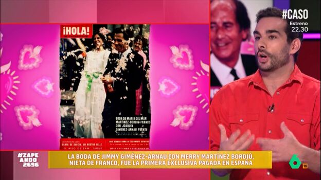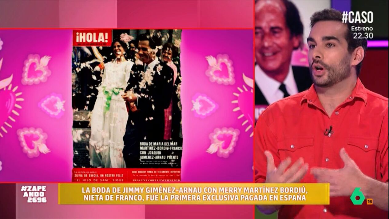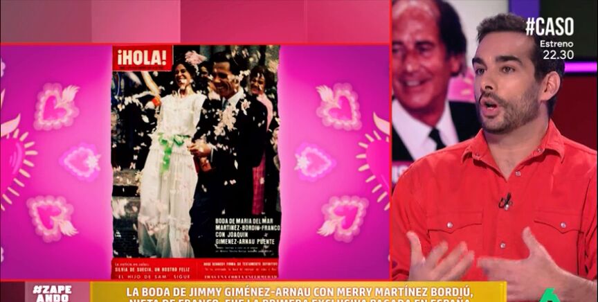 Juan Sanguino explica a los zapeadores que Jimmy fue el primer famoso en vender su boda con Merry Martínez-Bordiú, nieta de Franco. Su boda fue la primera exclusiva que pagó la revista '¡Hola!', en España y que al final la pareja fue engañada por Francis Franco, quien se llevó casi el 80% del dinero de la exclusiva.
