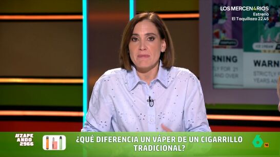 La experta señala que, ante la nueva ley, "váper y tabaco van al mismo saco", de manera que también está prohibido vapear en terrazas o entornos sanitarios y escolares, pues "aunque huela a melocotón, también es nicotina". Esta regulación se debe a que, al ser un consumo "invisible y socialmente aceptable", provoca que "te enganche más rápido".