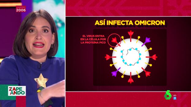 Boticaria García visita el plató de Zapeando para hablar de la sexta ola de la pandemia del coronavirus por culpa de la variante Ómicron. ¿Por qué esta siendo más contagiosa que las otras? La experta explica a través de una fotografía del COVID cómo es la forma de infectar de Ómicron, el cual tiene hasta 32 "mutaciones en la llave que abre las células humanas".