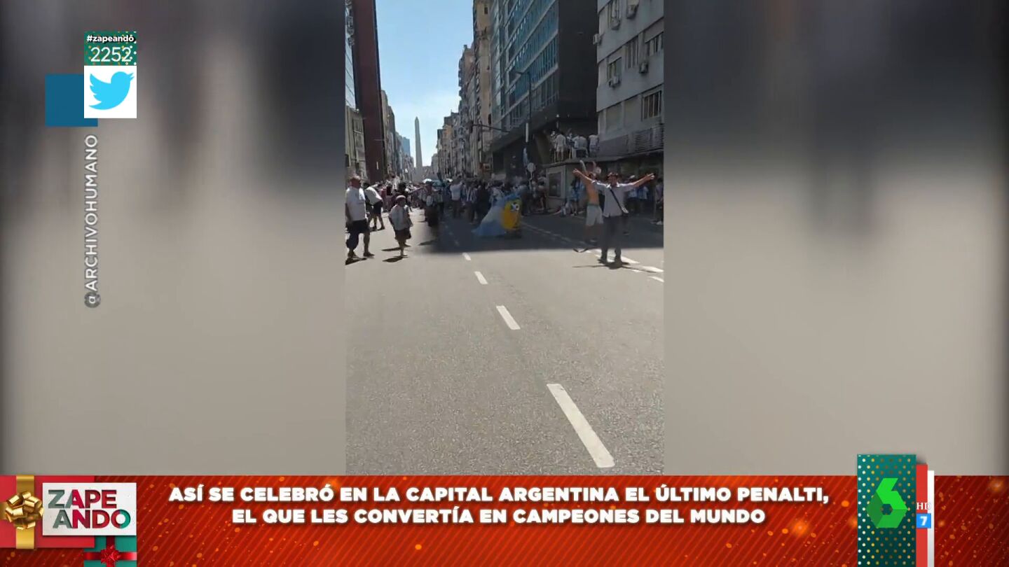 Miki Nadal repasa en el plató de Zapeando las imágenes más destacadas que ha dejado la final del Mundial de Qatar. Por ejemplo, la de Leo Messi levantando el trofeo con una túnica negra muy importante para Qatar y que el emir se la pone únicamente a personas relevantes. Además, Argentina se volvió loca tras ganar a Francia, algo que se pudo ver en las calles de Buenos Aires mientras se llevaba a cabo la tanda de penalties.