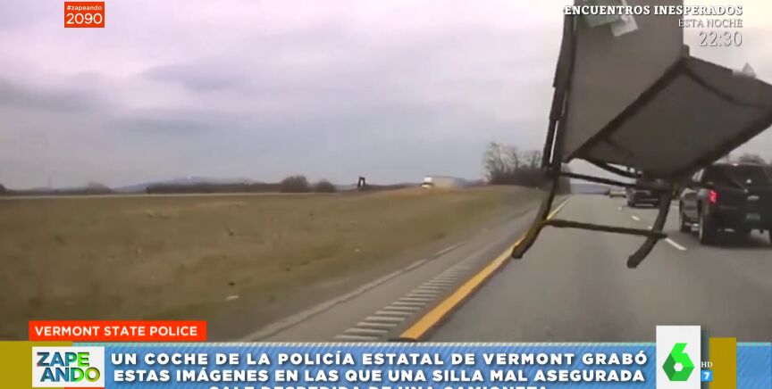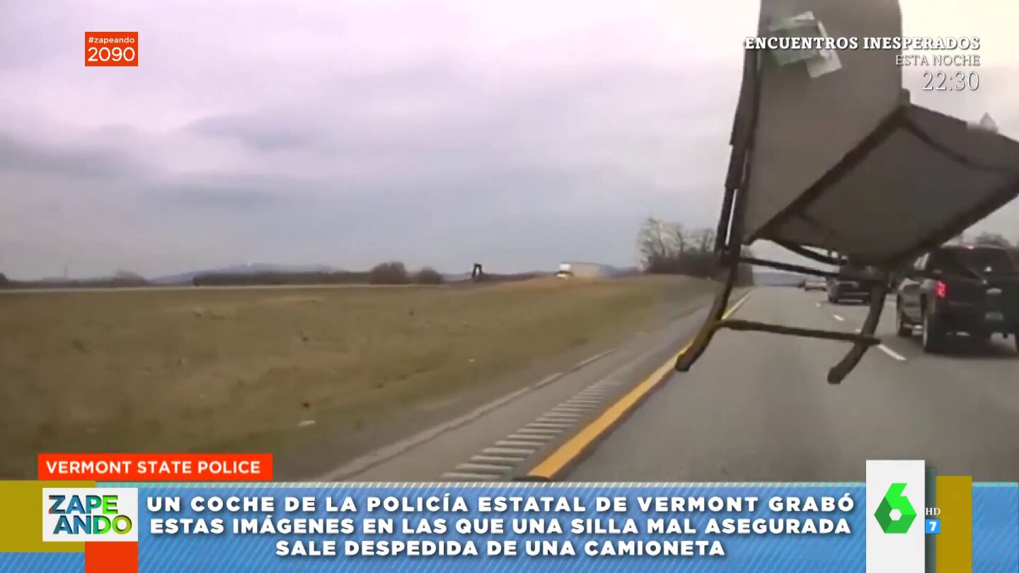 "Ya sabemos que las carreteras son peligrosas y hay que tener cuidado", asegura Miki Nadal a sus compañeros antes de mostrarles su vídeo viral del día, en el que una silla 'ataca' a un coche de policía. "Esta nueva amenaza ha sucedido en Vermont, Estados Unidos" y ha afectado a la luna delantera, que quedó totalmente destrozada como se puede apreciar en las imágenes, del vehículo oficial en el que se desplazaban los agentes.