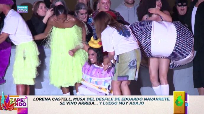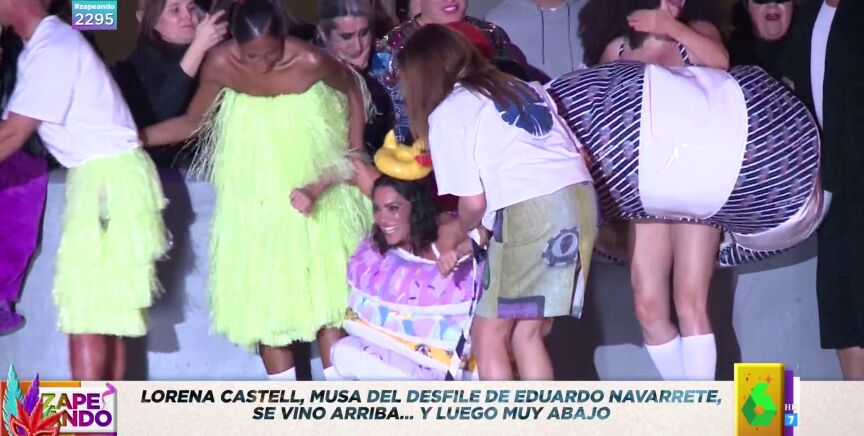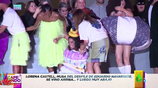 "Vamos con algo muy fuerte que le ha pasado a la Mocatriz de Zapeando, Lorena Castell", anuncia Dani Mateo a sus compis de mesa. Y, es que, la catalana fue la musa del diseñador Eduardo Navarrete en el desfile de su nueva colección de baño, para el que tuvo la idea de subir a todos los modelos sobre patines: "Todo parece ir muy bien, pero la pericia que Lorena Castell tiene la vimos en El Desafío y, al final, pasó lo todo el mundo sabía que iba a pasar".