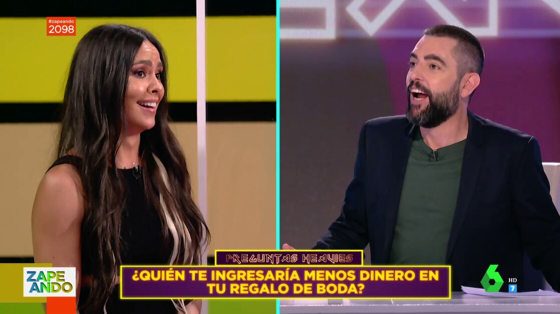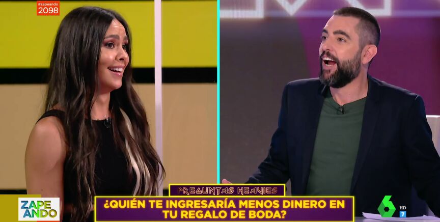 "Cristina, prepárate porque te toca contestar", advierte Dani Mateo a Cristina Pedroche que es su turno en las preguntas heavys de Zapeando. "¿Quién te ingresaría menos dinero en tu regalo de boda?", le pregunta una espectadora. Pedroche lo tiene claro y coloca a Dani Mateo en primera posición ante la indignación del presentador.