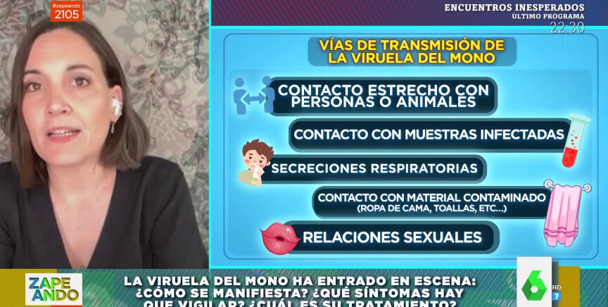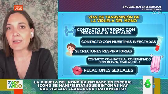 Para saber más sobre la 'viruela del mono', Dani Mateo conecta en directo con Boticaria García, quien explica todas las claves de este virus que ha llegado de repente. "La viruela de toda la vida está erradicada, pero la del mono no, que es primera hermana pero un poco diferente", explica la experta, que detalla en el vídeo principal de esta noticia cómo se contagia. "La principal vía de contagio es el contacto estrecho con personas que lo tengan o animales", destaca Boticaria García, que explica que también puede ser a través de fluidos o heridas. Además, la experta declara que otra vía de contagio son las heces y las relaciones sexuales. Por último, Boticaria García explica qué síntomas alertan de este virus y destaca principalmente uno: "A los cinco días salen ampollas en la cara, manos o pies".