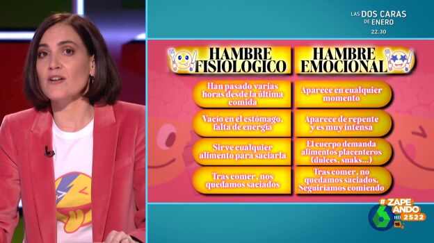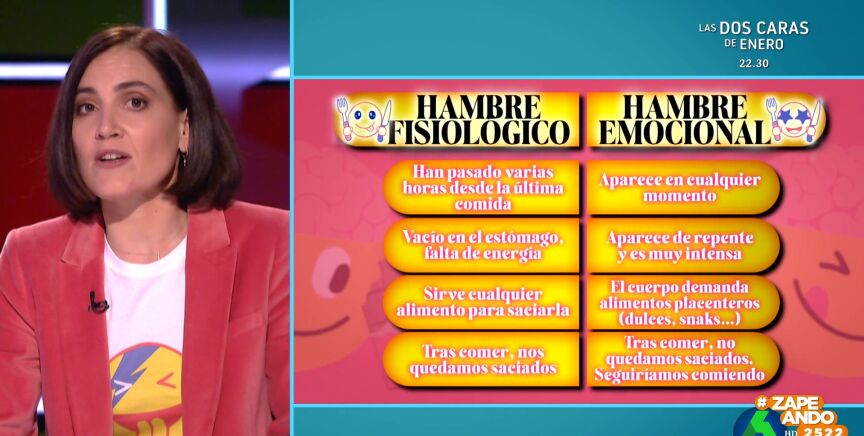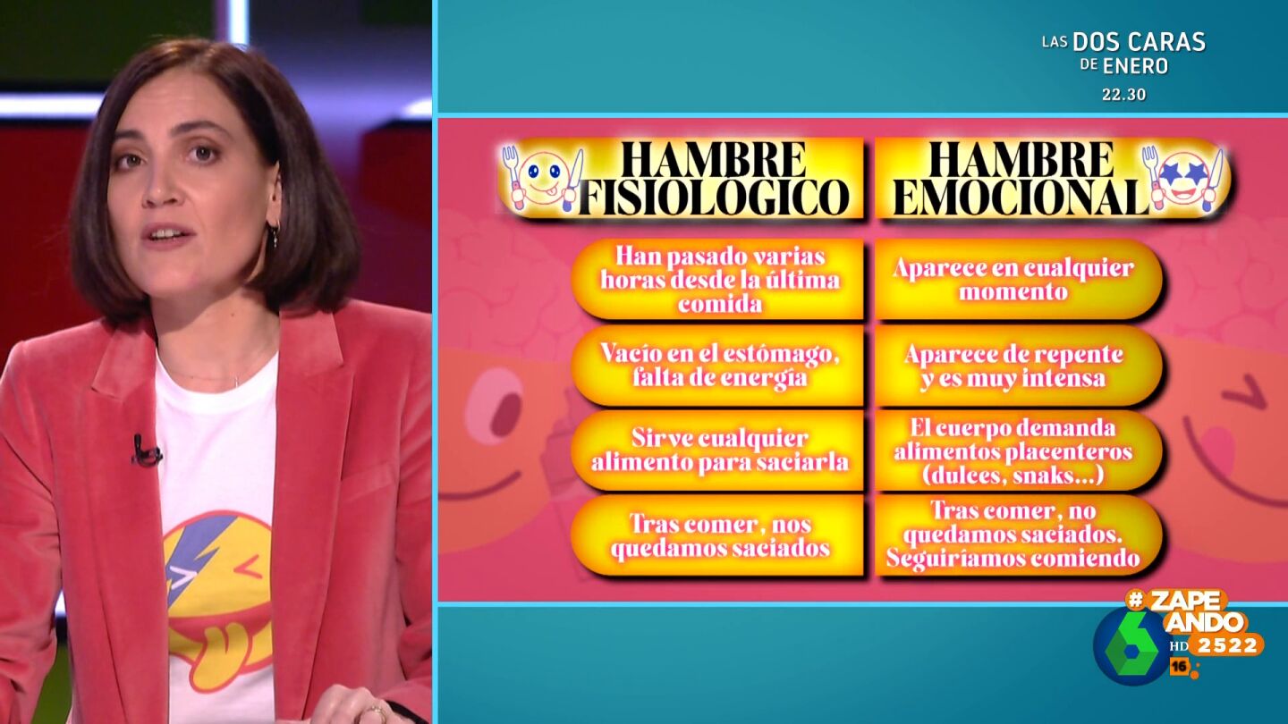 Por último, destaca que no se tiene la misma sensación al acabar de comer, pues si se trata de hambre fisiológico, quedamos saciados, mientras que el en segundo caso, "las mismas emociones que te han llevado a comer siguen ahí".