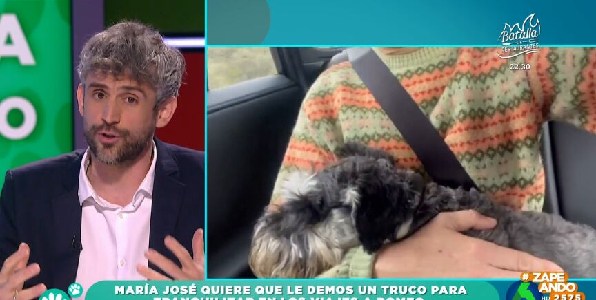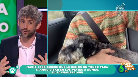 La Semana Santa es un momento del año en el que muchos aprovechan para viajar y algunos, como María José, se llevan también a sus mascotas. Sin embargo, esta espectadora de Zapeando cuenta que su perro Romeo sufre mucho estrés durante el viaje y pide un truco al veterinario Víctor Algra para poder tranquilizarle.