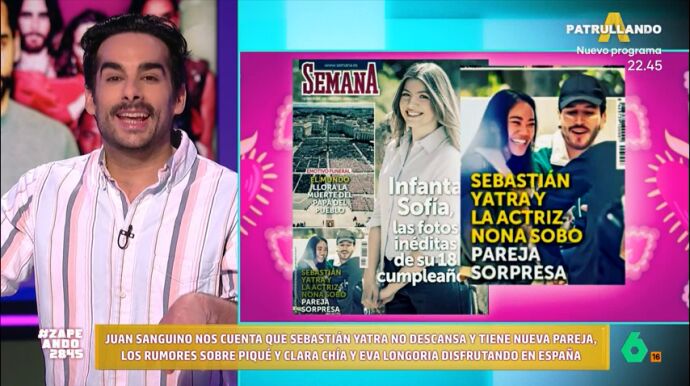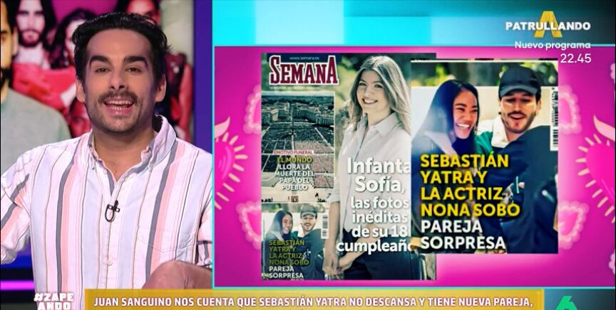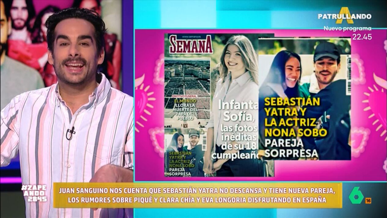 Juan Sanguino visitó el plató de Zapeando con los últimos cotilleos del mundo del corazón. En esta ocasión, el periodista comentó cómo la revista Semana ha pillado a Sebastián Yatra junto a la actriz Nona Sobo, y apunta a que podrían estar comenzando una relación.