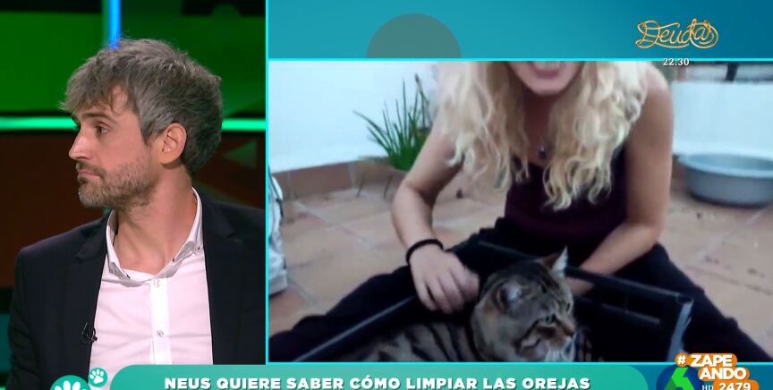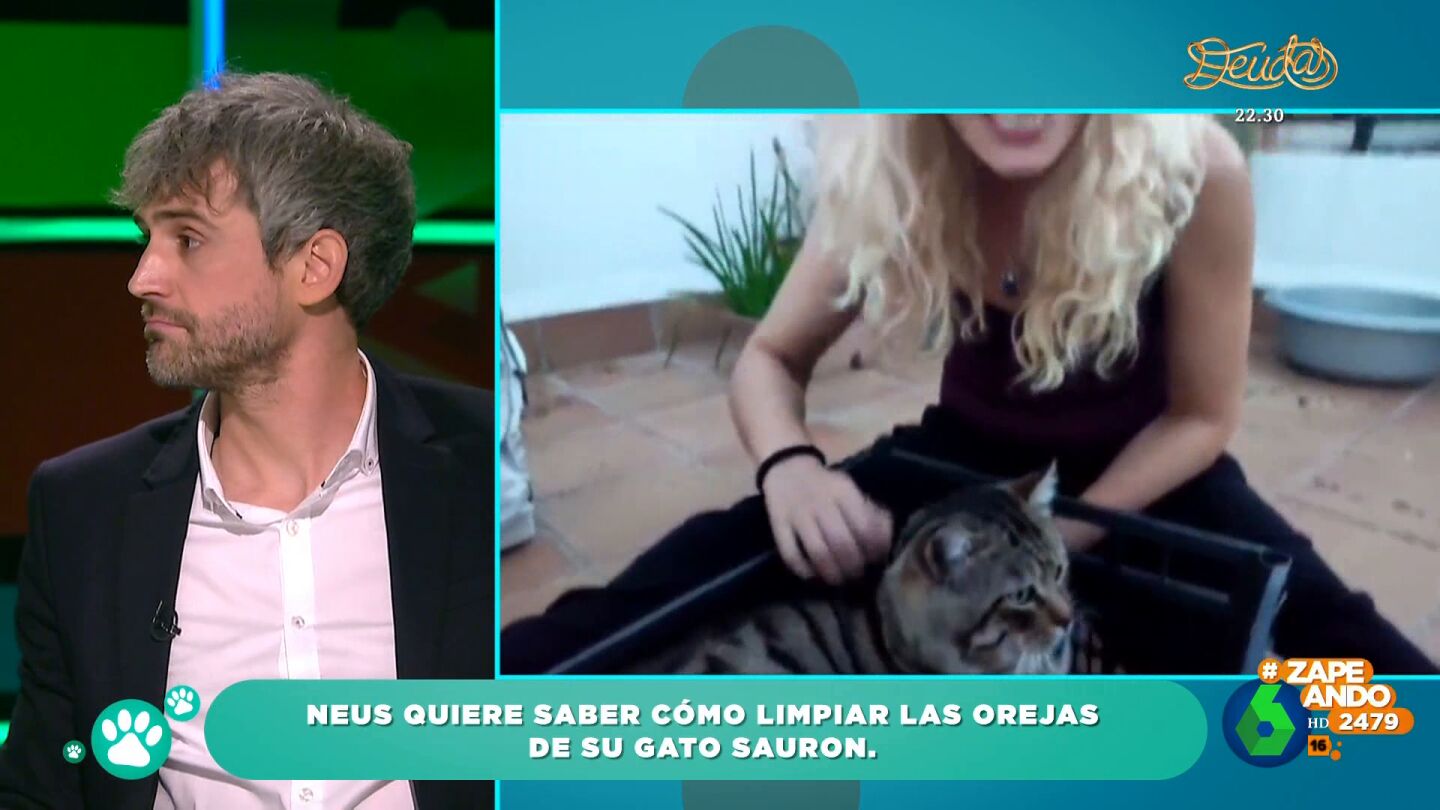 El veterinario de Zapeando, Víctor Algra, atiende a la consulta de Neus y su gato Sauron. Como explica, "a veces se le hace un poco de suciedad dentro de las orejas" por eso pregunta cuál es la mejor manera de limpiárselas.