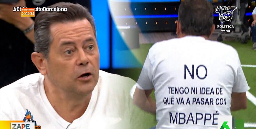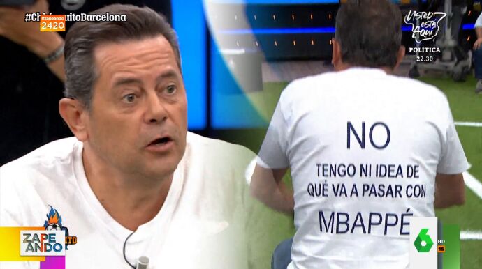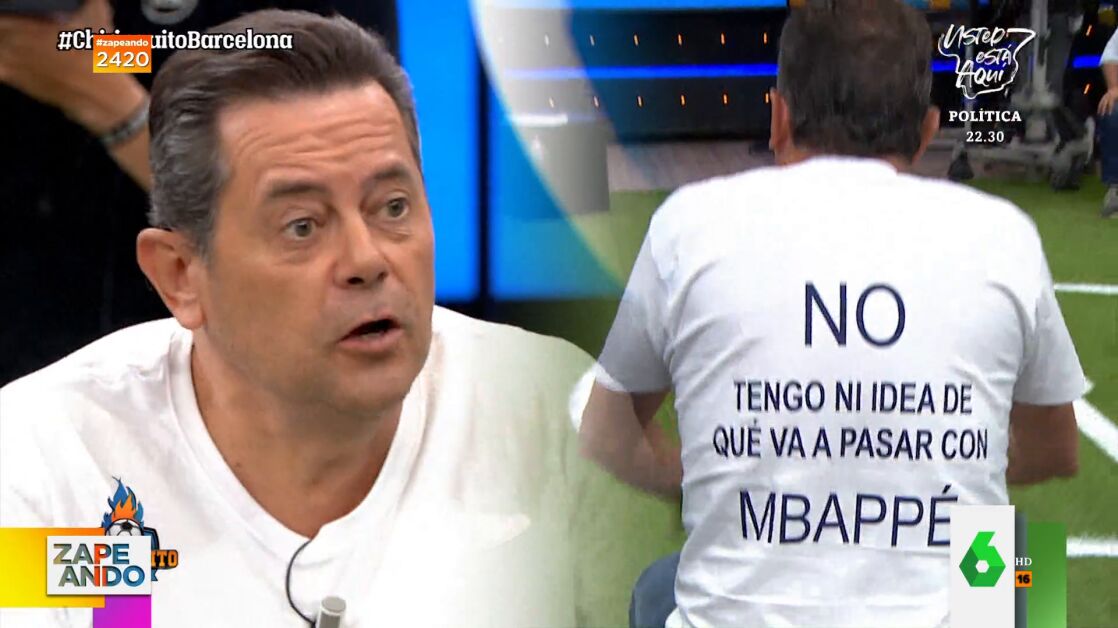 El periodista deportivo confiesa en 'El Chiringuito' que, harto de que le acribillasen a preguntas sobre la llegada de Mbappé al club blanco, decidió hacerse una camiseta para que le quedase claro a todo el mundo lo que sabe.
