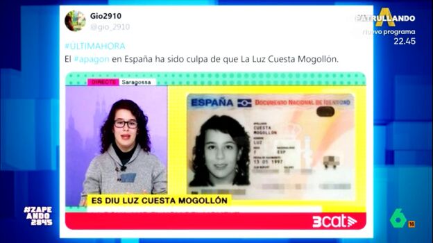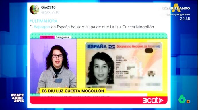 Luz, en respuesta al post, "lo ha negado todo alegando que ni siquiera vive en España", explica María Gómez. "Esto confirmaría la tesis de que se trató de un ataque desde el exterior", añade la zapeadora. "Al ver la que se ha liado, Luz ha decidido cambiarseel nombre. Ahora se llama 'Lola Mento'", añade Nacho García.