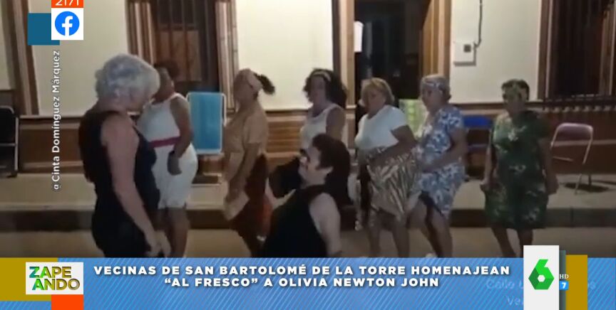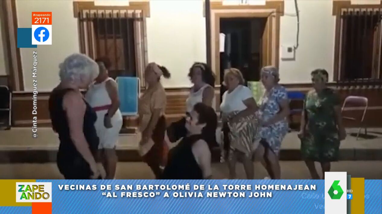 "Siguen sucediéndose los homenajes a Olivia Newton-John", destaca Miki Nadal, que muestra en el plató de Zapeando uno de los más simpáticos que ha visto. Se trata de un vídeo de unas vecinas de San Bartolomé de la Torre, Huelva, que han decidido homenajear a la actriz vistiéndose de ella y bailando el mítico tema de 'Grease'.