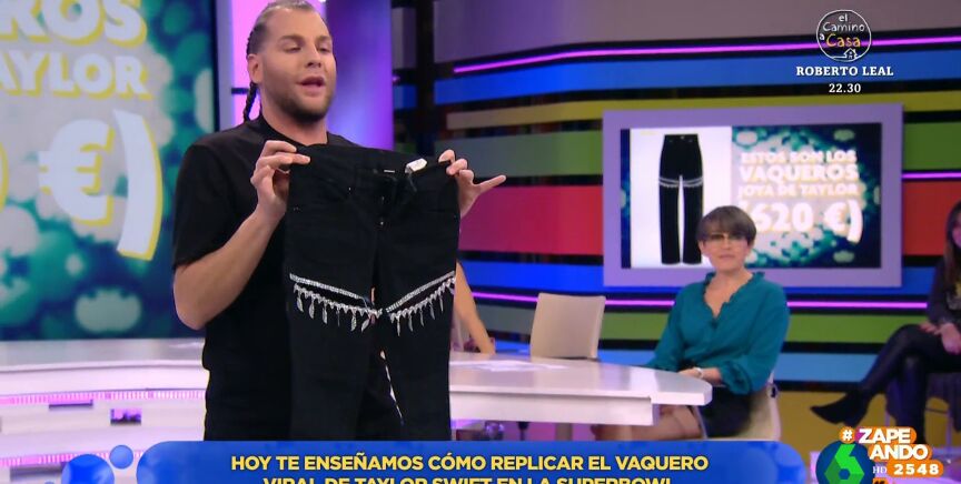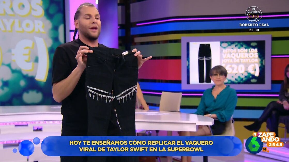Taylor Swift sorprendió en la final de la Super Bowl con unos pantalones negros que contaban con un detalle muy especial: unos pantalones joya con una abertura en cada pernera decorada con pequeños brillantes. Eduardo Navarrete visita Zapeando para mostrar como recrear la prenda por muy poco dinero.