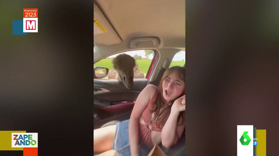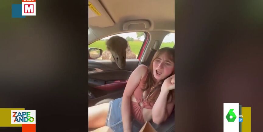 En el vídeo principal de la noticia te dejamos el momento en el que el avestruz se acerca a la chica, mete la cabeza por la ventanilla del coche y picotea en la bolsa que ella llevaba para alimentar a los animales. "Fue ella la que ofreció la comida", observa Quique Peinado.