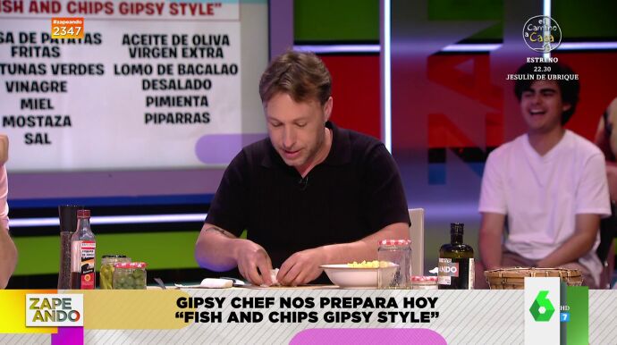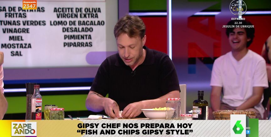 Con motivo de la coronación de Carlos III este próximo sábado, 6 de mayo,Gipsy Chef cocina en Zapeandouno de los platos británicos más míticos: el fish and chips. Pero lo hace con una receta muy al 'Gipsy Style': "Vamos a empezar por mi versión de la salsa", espeta el cocinero, que explica que "normalmente le ponen por encima una salsa vinagrosa", pero él ha querido versionarla.