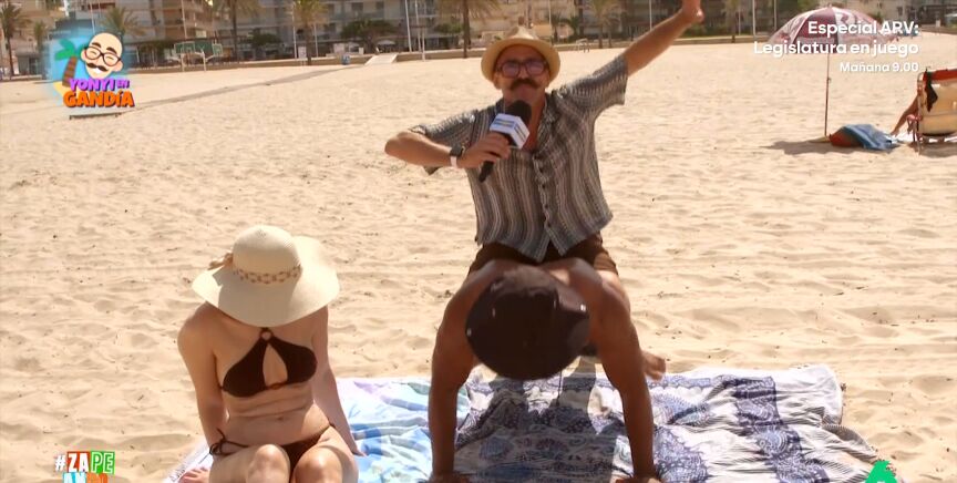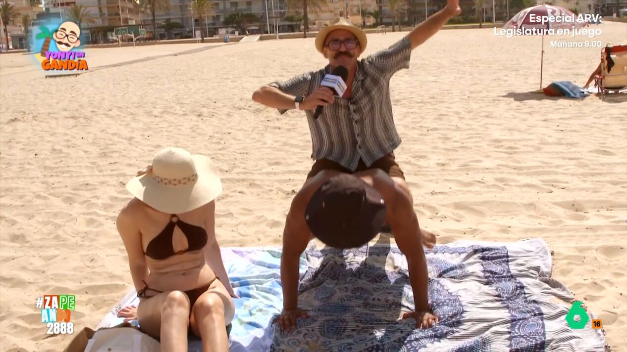 Yonyi Arenas lleva el 'zapeadvisor' de este verano hasta la playa de Gandía, donde además de preguntar a la gente qué se lleva a comer, los desafía a hacer unas flexiones para ver si están en forma.