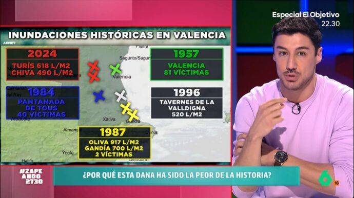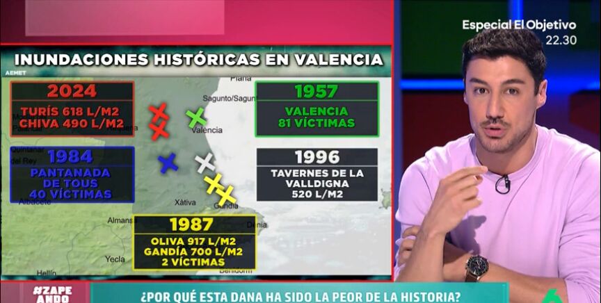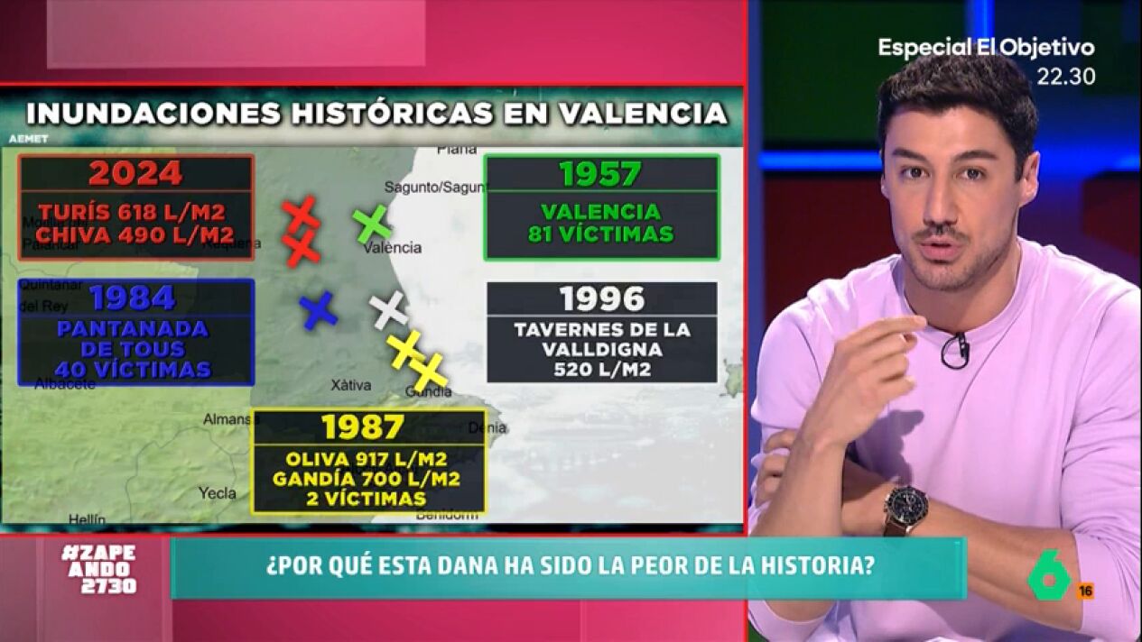 El meteorólogo de laSexta explica que en otras ocasiones las riadas terminaban en el mar pero, en esta ocasión, comenzaron en poblaciones más alejadas de la costa lo que ha hecho que se hayan destrozados numerosos pueblos.