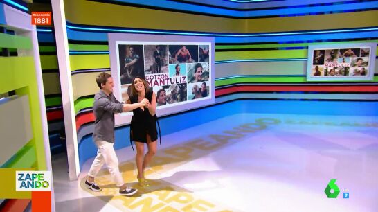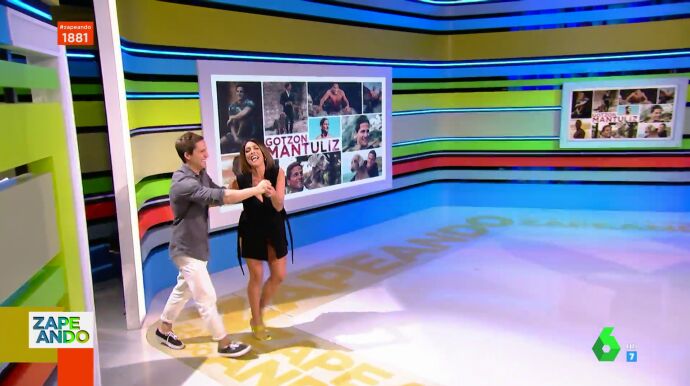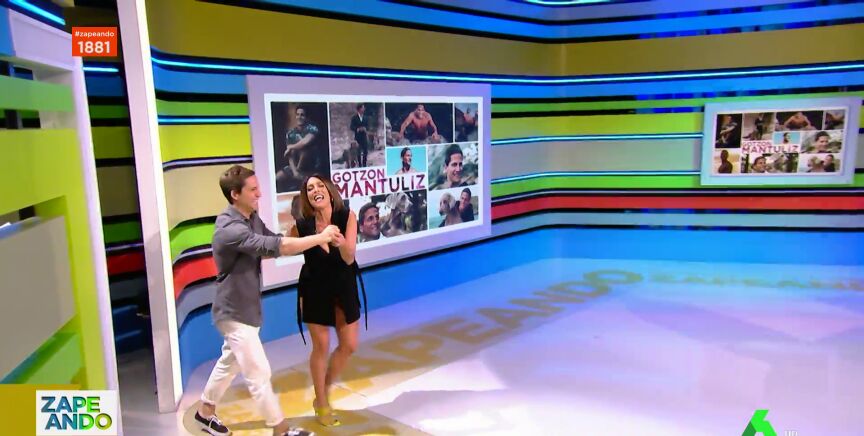 Lorena Castell se levanta por sorpresa para recibir a Gotzon Mantuliz, al que la zapeadora va a recoger a un lado del plató. Y es que Castell quería recibirlo de una forma "espectacular" como nueva presentadora.