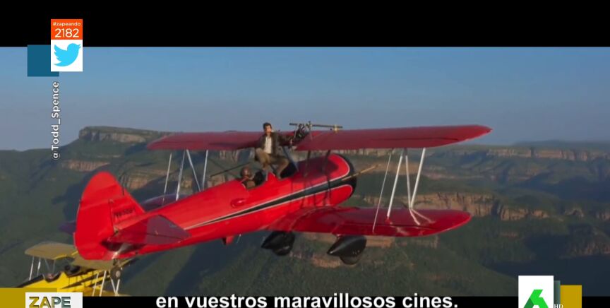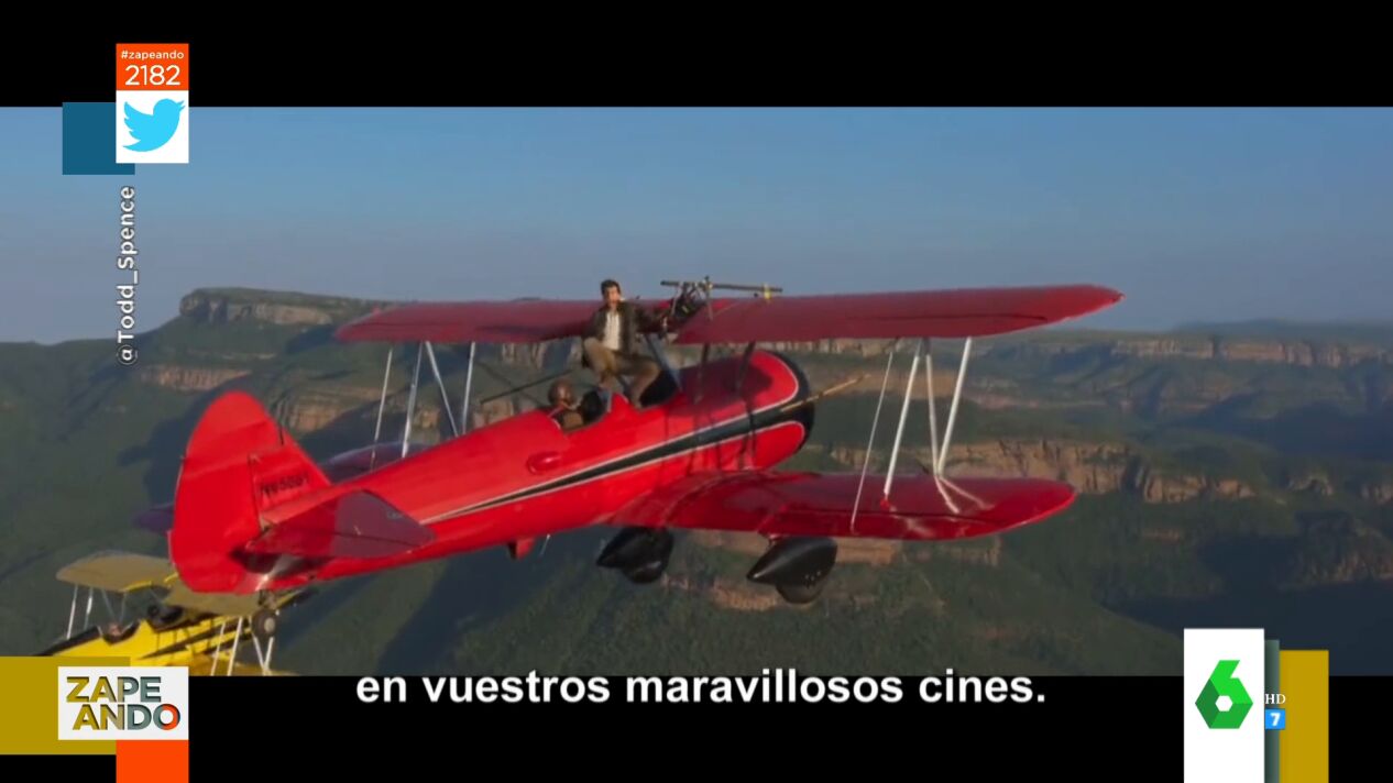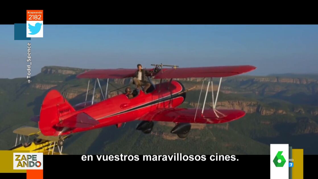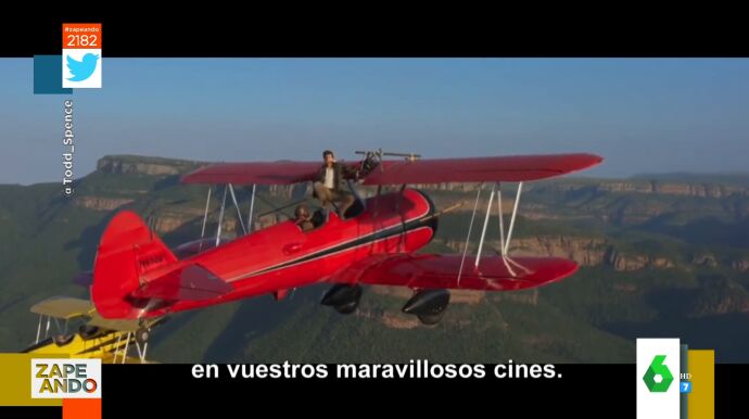 Dani Mateo no da crédito al ver la afición de Tom Cruise "a jugarse la vida". Y es que el presentador de Zapeando muestra en el plató lo último que se le ha ocurrido al actor para promocionar el próximo estreno de 'Misión imposible 7': subirse a una avioneta agarrado con una sola mano sobre un cañón de Sudáfrica.