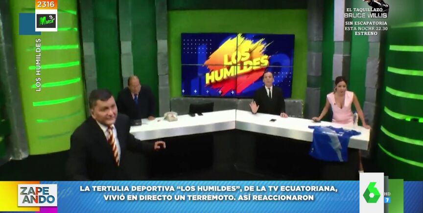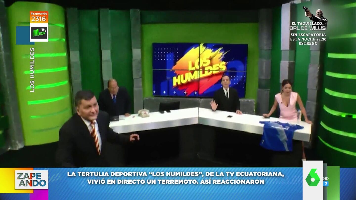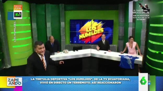 La tertulia deportiva 'Los humildes', de la televisión ecuatoriana, vivió en directo un terremoto. Así reaccionaron cada uno de los colaboradores. A excepción del presentador Roberto Bonafont, que mantuvo la calma y el tipo en todo momento.