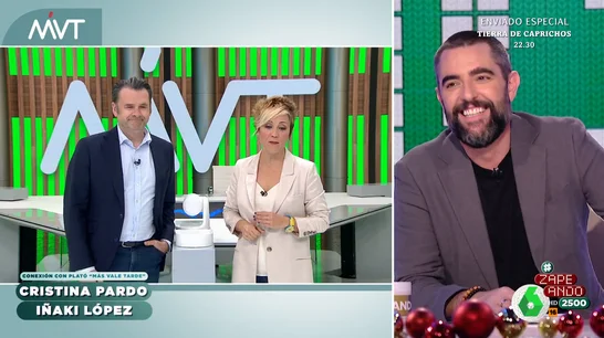 Dani Mateo conecta con 'Más Vale Tarde' y se pregunta si Iñaki López y Cristina Pardo tienen ya una opinión sobre qué traje debería llevar para presentar las Campanadas de laSexta, ante lo que el vasco admite que el que más les ha gustado es el de "koala": "Somos fans".