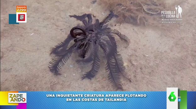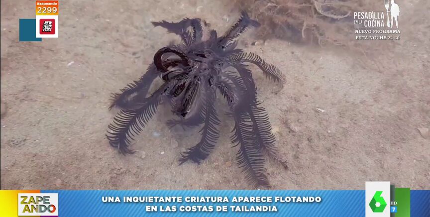 "Vamos a comenzar hablando de cosas que aparecen en la playa y que cuesta saber qué son", anuncia Dani Mateo a sus compis de Zapeando, a los que muestra las inquietantes imágenes virales de la criatura que ha aparecido en una playa de Tailandia: "Ya hay teorías sobre su origen. La primera, por supuesto, la más lógica: Puede tratarse de algo extraterrestre", espeta el presentador del programa, que pregunta a los colaboradores qué les parece.