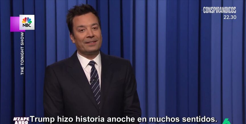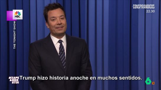 Jimmy Fallon ha destacado al inicio de su programa que "la victoria de Trump se ha convertido en un hito histórico en la democracia americana" ya que es "el primer delincuente convicto convertido en presidente". "Qué gran país los Estados Unidos", afirma Quique Peinado, "puedes ser presidente si estás bajo arresto, si estás condenado... no importa tu color de piel, puedes ser incluso naranja".