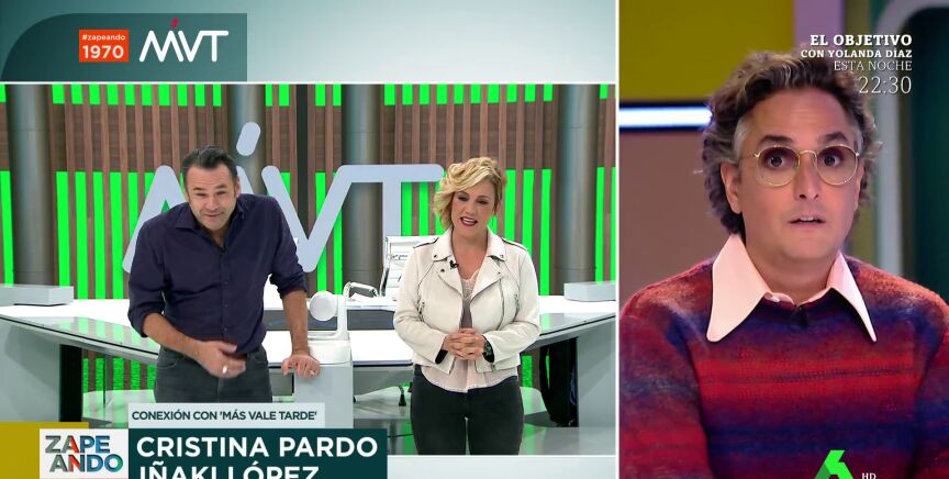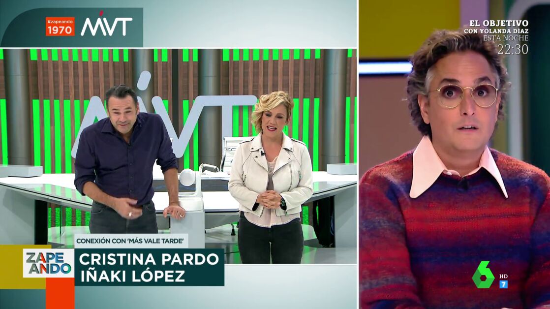 "Quiero que conozcas a una pareja que es fenomenal", afirma Dani Mateo a Josie, que espera en plató tras haber terminado su sección. Y es que el presentador de Zapeando quiere que el experto en moda está en el plató cuando realice su tradicional conexión con Iñaki López y Cristina Pardo. A ambos, Josie les conoce de compartir espacio mientras los presentadores daban las Campanadas. "Yo contigo me he tomado las uvas", destaca Josie a Cristina Pardo, a la que le recuerda que va "con el mismo pelo": "Lo que no entiendo es cómo no te has cansado, te voy a llevar a mi peluquero".